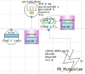 Pharmacodynamic (PD) can model dynamic effect of a drug on target tissue or cells. Main components are Effect (LinearEffect, EmaxEffect,SigmoidEmaxEffect) that translates from drug concentration into a generic effect quantity. |