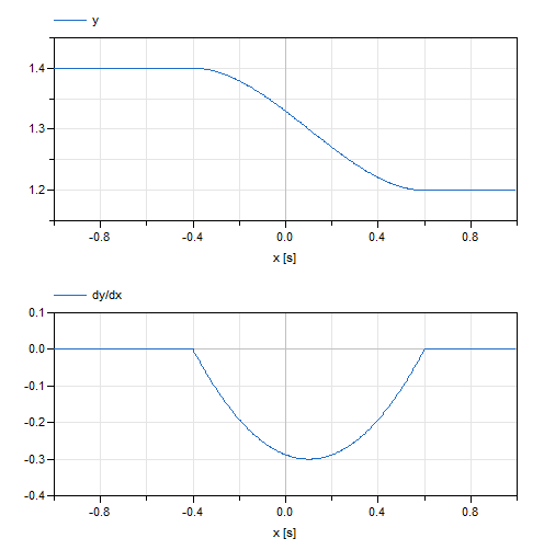 The figure below shows the function y and its 1st derivative dy/dx for the following input: x_max = -0.4, x_min = 0.6, y_max = 1.4, y_min = 1.2.