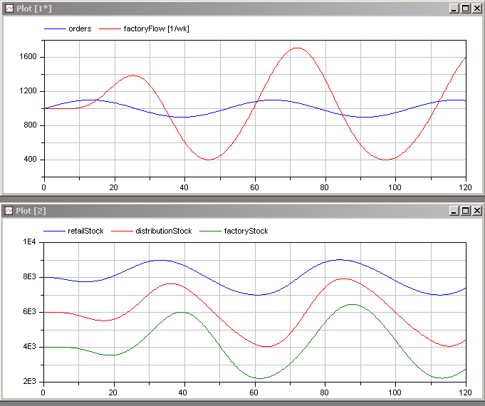 Simulate the model across 120 weeks, and plot on one graph the incoming orders and the production flow in the factory and on a second graph the levels of goods in retail, distribution, and the factory as functions of time: