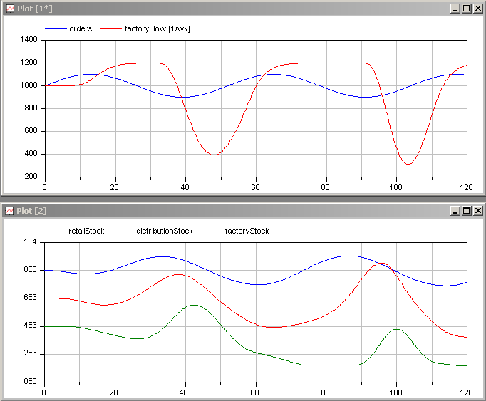 Simulate the model across 120 weeks, and plot on one graph the incoming orders and the production flow in the factory and on a second graph the levels of goods in retail, distribution, and the factory as functions of time:
