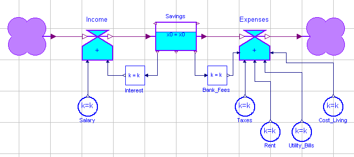 This example describes the savings of a person. The savings (a variable that can be accumulated, i.e., a Level) is controlled by income and expenses (Rate variables). There are several categories of income (salary and interest), whereby the interest is proportional to the savings. There are also several categories of expenses, namely bank fees, taxes, utility bills, and cost-of-living expenses. The bank fees are also proportional to the savings. If the parameters are set correctly, the modeler can observe whether his or her savings will grow over time, or whether they will get depleted. Mass flows are represented by lilac connections, whereas information flows are depicted in blue. The two lilac clouds represent sources and sinks of masses. These are dummy models in our library. They were only provided to maintain the look-and-feel of the System Dynamics methodology.