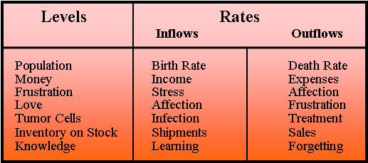 The methodology is built around the concepts of Levels and Rates. Levels are quantities that can be accumulated, whereas Rates are the quantities that control the increase and/or decrease of the Levels.