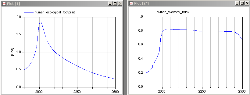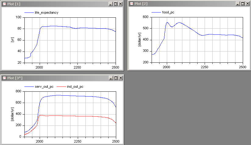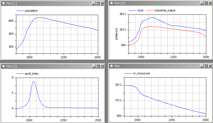 Simulate the model from 1900 until 2500, and display the same variables as in the book Limits to Growth: The 30-Year Update at page 245:
