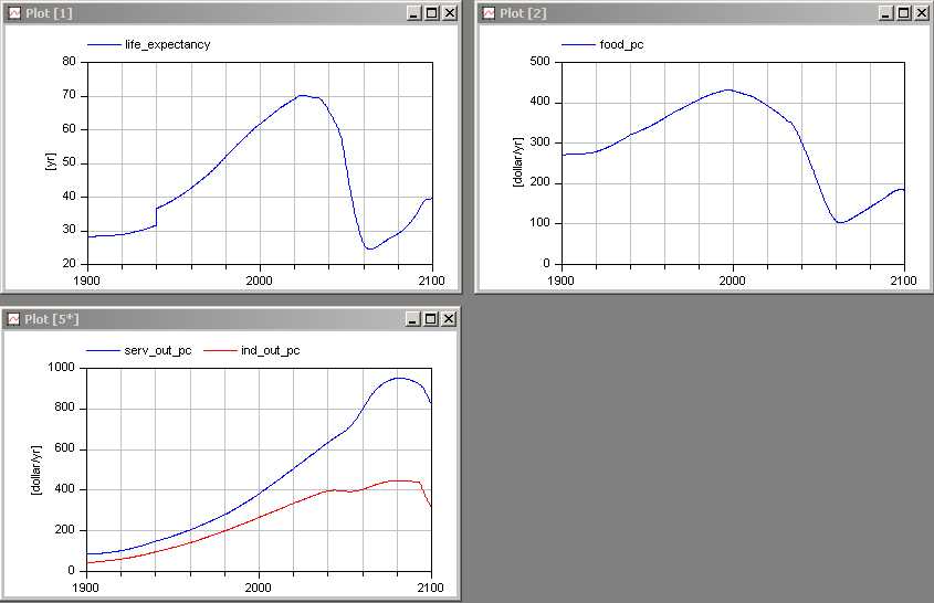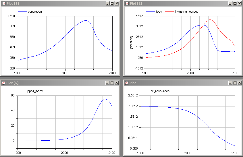 Simulate the model from 1900 until 2100, and display the same variables as in the book Limits to Growth: The 30-Year Update at page 173: