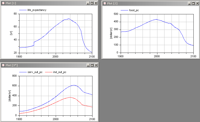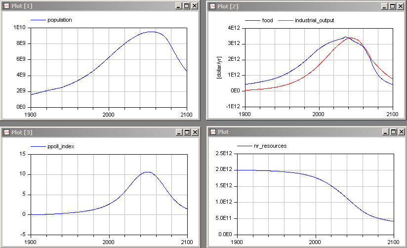 Simulate the model from 1900 until 2100, and display the same variables as in the book Limits to Growth: The 30-Year Update at page 215: