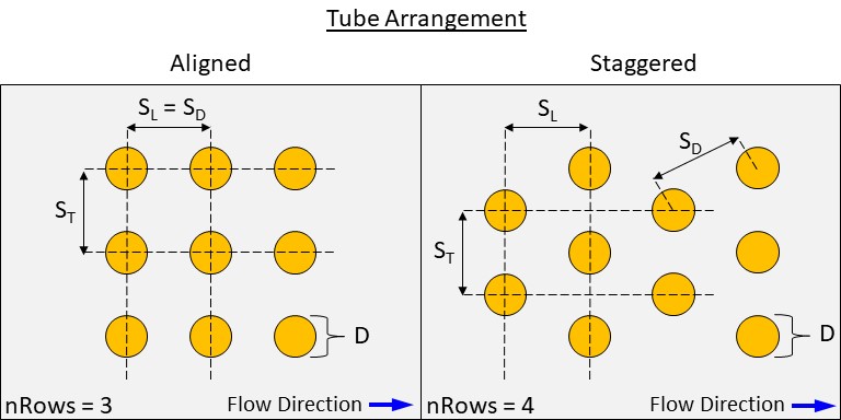 function Nu_Grimison_FlowAcrossTubeBanks input SI.ReynoldsNumber Re "Reynolds Number"; input SI.PrandtlNumber Pr "Prandtl Number"; input SI.Length D "Tube diameter"; input SI.Length S_T "Transverse (within same row) tube pitch"; input SI.Length S_L "Longitudinal (between rows) tube pitch"; input Real nRows = 10 "Not necessary if nRows >= 10"; input Boolean tubesAligned = false " = false if staggered"; output SI.NusseltNumber Nu "Nusselt number - Eq. 7.60 and 7.61"; end Nu_Grimison_FlowAcrossTubeBanks;