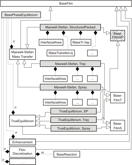The UML-diagram shows the structure of the film models. Different film models are located in the package BaseClasses, namely film models for Maxwell-Stefan Mass Transfer, True equilibrium, Enhancement factor, ...