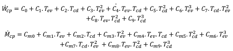 In the EN12900 standard, the compressor consumption and the mass flow rate are expressed as a function of the evaporation and condensation temperatures with the following equations: