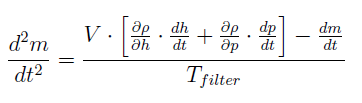 where u and y are the input and output signals, respectively. In this particular case, u is the mass variation calculated with the equation of state and y is the filtered mass derivative. This filter therefore acts as ”mass damper” and avoids transmitting abrupt variations of the flow rate due the density derivative discontinuity. The filtered mass accumulation in each cell is written: