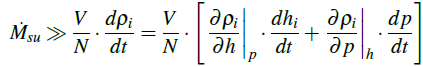 This strategy acts on the partial derivative of density with respect to pressure and enthalpy. The peak in the density derivative occurring after the transition from liquid to two-phase is truncated. The maximum time derivative of the density is a model parameter and the maximum partial derivatives are calculated using the following equation:
