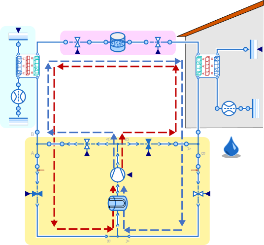 The flow direction is controlled by a system of valves and undirected junctions. In the parameter settings it can be chosen between "switching during simulation" or manually switching between cooling and heating mode prior to the simulation.