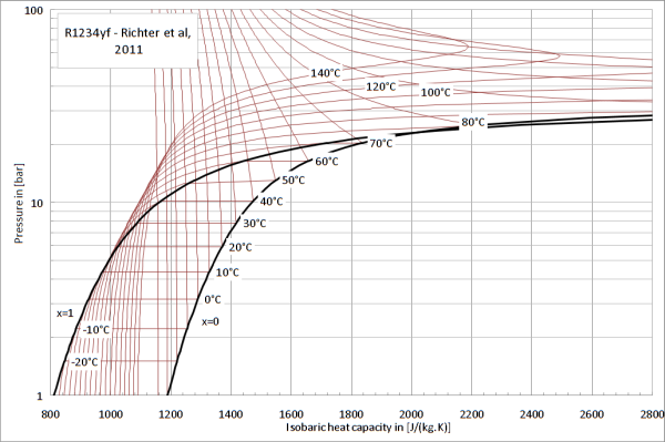This function calculates the specific heat capacity of R1234yf at constant pressure from the state record (e.g., use setState_phX function for input). The specific heat capacity is modelled by the fundamental equation of state of Richter et al (2011).
