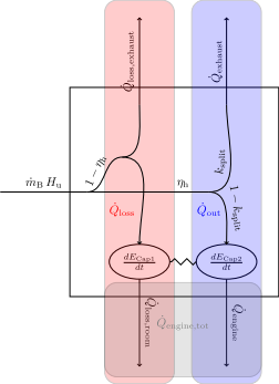 This model is based on the staticHeatFlow model. Two thermal capacitors are added, representing the thermal inertia of the engine itself and its cooling system.