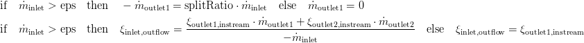 The mass flow calculation for outlet 1 (eps is the smallest possible number in Modelica) and the composition calculation at the inlet ensure that there is no division by zero for zero mass flow at the inlet.