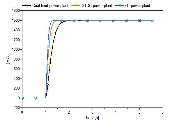 The results obtained with this model in the test-model TransiEnt.Producer.Electrical.Conventional.Check.TestSecondOrderContiuousPlant_PlantStart are shown bellow together with rough reference values from [2] are displayed bellow.