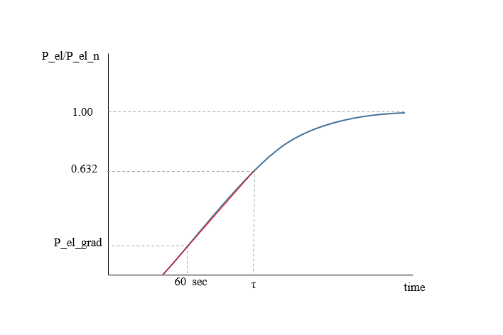 Using proportionality rules, the time constant of the model's first order block is definied as a function of the power plant's nominal ramp rate as follows: