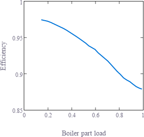From the part load of the boiler and the return flow temperature, the boiler efficiency and fuel heat input is calculated with characteristical lines.
