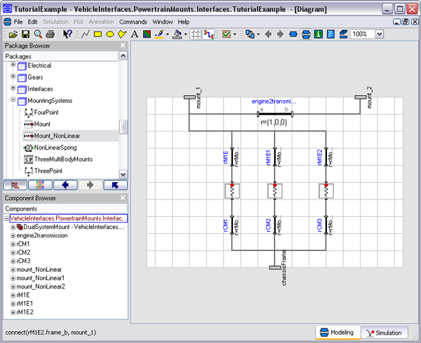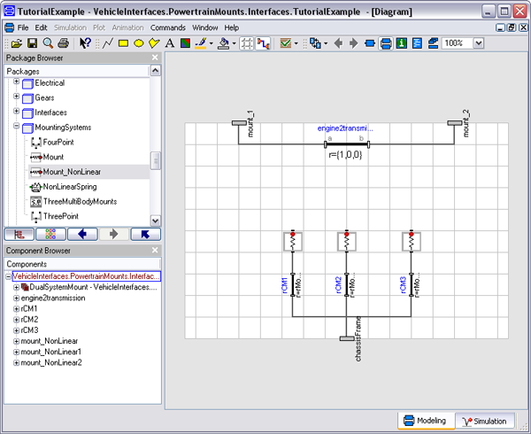 4. Add the elastic mount blocks, in this case they are defined in the PowerTrain library as PowerTrain.MountingSystems.Mount